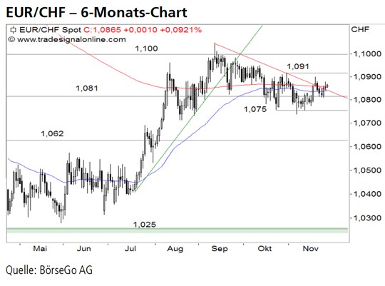 Ausblick: Die Seitwärtsphase bei EUR/CHF hält zunächst an. Erste positive Signale aus Sicht der Käufer sind aber feststellbar. Die Long-Szenarien: Die kurzfristig entscheidende Hürde im Chart befindet sich bei 1,091 CHF. Kann EUR/CHF diese Marke überwinden, wäre zum einen eine kurzfristige Bodenbildung im Chart abgeschlossen. Zum anderen könnte man in diesem Fall auch von einem neuen Aufwärtstrend sprechen, der EUR/CHF zunächst Potenzial auf 1,100 CHF liesse. Gelingt auch ein Ausbruch über diese Marke, wäre das Septemberhoch bei 1,105 CHF das nächste Ziel. Das ehemalige Unterstützungsniveau bei 1,200 CHF wäre aber selbst dann noch weit entfernt. Die Short- Szenarien: Auf der Unterseite ist EUR/CHF bei 1,081 und 1,075 CHF massiv unterstützt. Solange die Käufer diese beiden Marken halten können, haben die Bären das Nachsehen. Unterhalb von 1,075 CHF könnte dagegen eine Verkaufswelle anrollen, die das Währungspaar bis zur nächsten Unterstützung bei 1,062 CHF drückt.