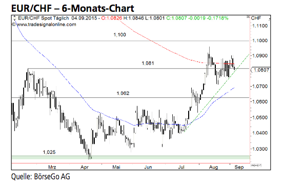 Nach einem bullishen Doppelboden auf diesem Niveau stieg der Wert ab Juli in Richtung des Widerstands bei 1,062 CHF an, der Anfang August überschritten wurde. Dieses Kaufsignal sorgte für einen steilen Anstieg an die Barriere bei 1,100 CHF. Seither konsolidiert das Paar diese Kaufwelle im Bereich des vormaligen Widerstands bei 1,081 CHF.