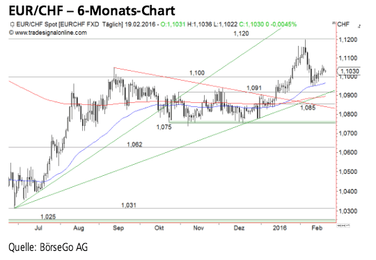 Dieser führte nach dem Anstieg über die 1,100 CHF-Marke an den nächsthöheren Widerstand bei 1,120 CHF. Die Barriere konnte bislang allerdings nicht überwunden werden. Vielmehr brach das Paar nach dem Erreichen der 1,120 CHF-Marke deutlich ein und fiel zwischenzeitlich sogar unter 1,100 CHF zurück.