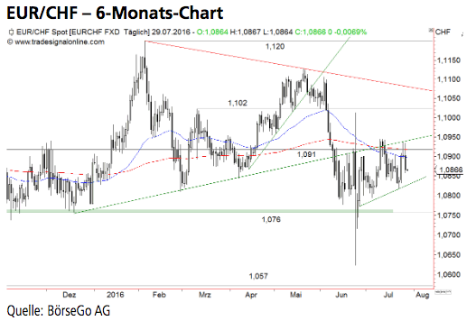 Rückblick: Das Währungspaar EUR/CHF bewegte sich seit August 2015 oberhalb der 1,080 CHF-Marke seitwärts. Ab Dezember des vergangenen Jahres kam es zunächst zur Ausbildung eines moderaten Aufwärtstrends, der jedoch im Juni beendet wurde.