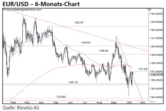 Mit diesem Hoch begann jedoch eine übergeordnete Korrekturphase, die aktuell noch immer andauert. In ihrem Verlauf fiel EUR/JPY im August dieses Jahres an die 135,15 JPY-Marke zurück, bildete dort jedoch im September einen Doppelboden aus und stoppte damit die Abwärtsbewegung. Mit dem Ausbruch über den Widerstand bei 137,50 JPY kam es zu einer Erholung, die den Wert bis an die Kurshürde bei 140,03 JPY führte. Diese Marke wurde kurzzeitig sogar überschritten, doch scheiterten die Käufer direkt im Anschluss an der mittelfristigen Abwärtstrendlinie. Seit Ende September ist das Paar wieder unter Druck und brach Mitte Oktober bereits vorübergehend unter die 135,15 JPYMarke ein. Kurz vor der markanten Unterstützung bei 133,80 JPY starteten die Bullen jedoch einen Gegenangriff und trieben EUR/JPY wieder über die 135,15 JPY-Marke an. Diese Kaufwelle wurde zunächst bei 137,03 JPY abgebremst. Seither befindet sich der Wert in einem bullishen Rücklauf an die Haltemarke bei 135,15 JPY, die zum Ausgangspunkt für eine erneute Aufwärtsbewegung werden könnte.
