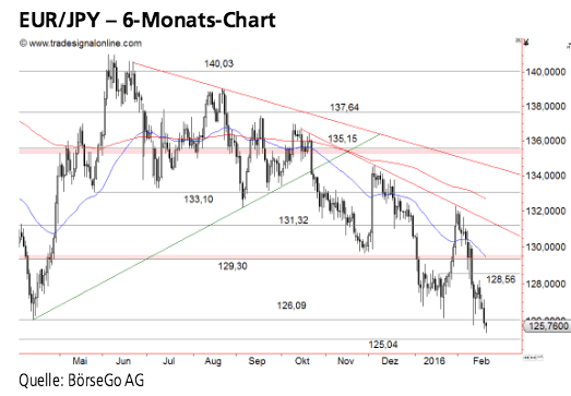 Sie ging nach dem Bruch einer mittelfristigen Aufwärtstrendlinie und dem Unterschreiten der Unterstützung bei 133,10 JPY in einen Ausverkauf über. Dieser drückte das Paar bis zum Januar an die 126,09 JPY-Marke zurück. Kurz vor einem weitreichenden Verkaufssignal starteten die Bullen dort zwar einen starken Konter, dieser scheiterte jedoch an der mittelfristigen Abwärtstrendlinie auf Höhe von 132,00 JPY. Es folgte ein Kursrutsch, der das Devisenpaar Anfang Februar wiederum bis 126,09 CHF einbrechen liess. Nach einer leichten Gegenbewegung fiel EUR/JPY erneut in Richtung der zentralen Unterstützung zurück, die im gestrigen Handel unterschritten wurde.