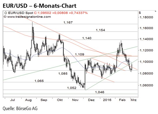 Rückblick: Anfang Februar lief es für die Käufer bei EUR/USD noch wie am Schnürchen. Das Devisenpaar liess den Widerstand bei 1,109 USD hinter sich und löste auf diese Weise ein Kaufsignal aus.