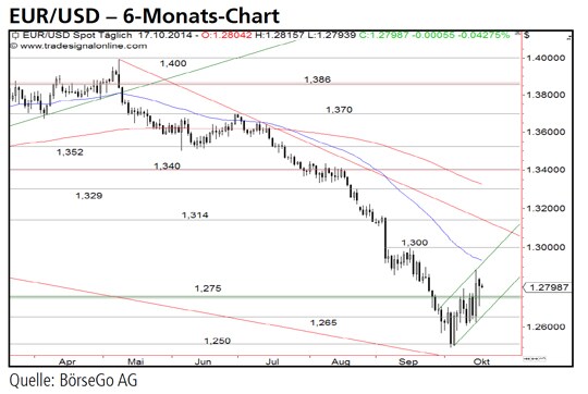 In deren Verlauf brach das Währungspaar innerhalb kürzester Zeit unter die wichtigen Unterstützungen bei 1,329 und 1,314 USD ein und bildete damit übergeordnete Verkaufssignale aus. Insbesondere der September war von einem massiven Kurseinbruch geprägt, der das Paar schliesslich sogar unter die Tiefpunkte des Jahres 2013 bei 1,275 USD einbrechen liess. In der Spitze fiel der Wert bereits bis an die Unterstützung bei 1,250 USD zurück. Erst diese Marke löste Anfang Oktober eine stärkere Erholung aus. Diese führte EUR/USD in dieser Woche über die 1,275 USD-Marke und damit in neutralere Kursregionen zurück. Problematisch ist dabei jedoch, dass sich die laufende Aufwärtsbewegung als bearishe Flaggenformation klassifizieren lässt. Dieses Trendfortsetzungsmuster spricht für eine weitere Abwärtsbewegung.