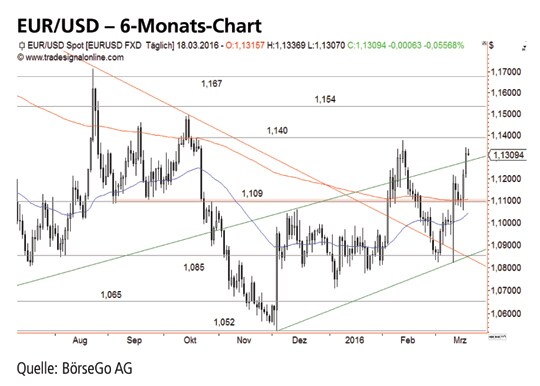 Ausblick: Der starke Konter der Bullen hat dazu geführt, dass das Währungspaar aktuell ein Kaufsignal anvisiert. Kurse über 1,140 USD dürften die Bullen weiter befügeln. Die Long-Szenarien: Kurzfristig könnte der Wert nochmals an das Zwischenhoch bei 1,120 USD zurücksetzen, dort Schwung holen und anschliessend in einer erneuten Kaufwelle über 1,140 USD ausbrechen. Damit hätte EUR/USD ein Kaufsignal gebildet und könnte die Hausse direkt bis an die Barriere bei 1,154 USD antreiben. Wird auch dieser zentrale Widerstand überwunden, käme es zu einer Ausweitung der Rally bis 1,167 USD. Die Short-Szenarien: Sollte der Wert dagegen in den kommenden Tagen nicht über 1,140 USD ausbrechen und anschliessend auch unter die 1,120 USD-Marke zurückfallen, würde es zu einer kurzen Korrektur bis 1,109 USD kommen. Diese Unterstützung dürfte allerdings zum Ausgangspunkt für einen weiteren dynamischen Anstieg werden. Erst bei einem nachhaltigen Ausverkauf unter diese Marke müsste man von einem vorläufigen Ende der Rally und einem Einbruch bis 1,085 USD ausgehen.