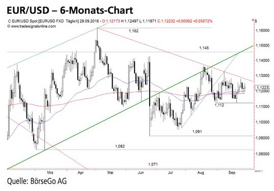 Bei EUR/USD kommt es seit März 2015 zu einer Seitwärtsphase, nachdem bei 1,046 USD nach einem massiven Ausverkauf ein Verlaufstief ausgebildet wurde.