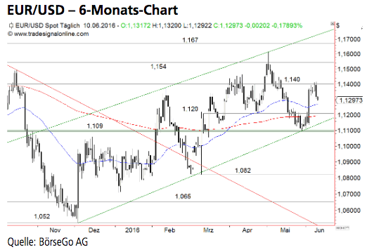Die Bullen haben bei EUR/USD aktuell die Chance, den Aufwärtstrend seit Ende des vergangenen Jahres fortzusetzen. Die Dynamik der letzten Tage unterstreicht ihre Ambitionen. Die Long-Szenarien: Kann sich der Wert wieder über der 1,140 USD-Marke etablieren, wäre ein kleines Kaufsignal aktiv und ein Anstieg bis an den nächsthöheren Widerstand bei 1,154 USD zu erwarten. Auf diesem Niveau könnte es zu einer kurzfristigen Korrektur kommen, der ein Anstieg über die Marke und ein Angriff auf den zentralen Widerstand bei 1,167 USD folgen dürfte. Sollte diese Marke im weiteren Verlauf durchbrochen werden, könnte sich die Rally bei EUR/USD bis 1,185 USD fortsetzen. Die Short-Szenarien: Misslingt der laufende Ausbruchsversuch über die 1,140 USD-Marke, könn- te es nach einem Rücksetzer bis 1,125 USD zu einem weiteren Anstieg an die Marke kommen. Derzeit würde jedoch erst ein Unterschreiten der 1,120 USD-Marke den Kaufimpuls der letzten Wochen neutralisieren und zu einem Rückfall bis 1,109 USD führen. Würde diese Unterstützung allerdings ebenfalls unterschritten, wäre ein kurzfristiges Verkaufssignal mit einem ersten Ziel bei 1,085 USD generiert.