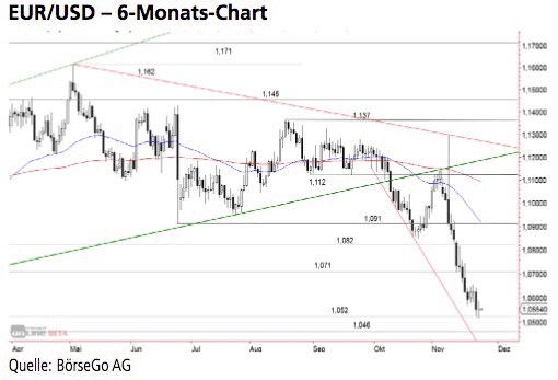 ... seitwärts weiter, wobei auf der Oberseite die 1,145 USD-Marke eine wichtige Widerstandszone darstellt. Die Notierungen konnten innerhalb dieser Seitwärtsbewegung im Verlauf 2016 einen Aufwärtstrend etablieren, welcher Mitte Oktober nach unten durchbrochen wurde. Auf der 1,091 USD-Marke gelang vor den US-Wahlen eine Gegenbewegung, welche im Zuge des Wahlausgangs im Bereich des gebrochenen mittelfristigen Aufwärtstrends scheiterte. Die Notierungen drehten somit an der 1,112 USD-Marke ab und gingen in den vergangenen Wochen in eine steile Abwärtsbewegung über. Eine untergeordnete Unterstützung bei 1,052 USD wurde zuletzt erreicht.