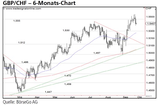An dieser Stelle kam es ab Juli zu einer leichten Korrektur, die den Wert an die Haltemarke bei 1,497 CHF zurückführte. Anfang September kamen die Bullen dort massiv in den Wert zurück und trieben GBP/CHF in einer steilen Kaufwelle über die kurzfristige Abwärtstrendlinie und den Widerstand bei 1,530 CHF an. Angestachelt durch dieses Kaufsignal setzte sich der Aufwärtsimpuls direkt weiter bis an die 1,555 CHF-Marke fort, die in dieser Woche bereits mehrfach vorübergehend überschritten wurde.