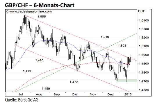 Die Entwicklung seit Ende Dezember 2012 zeigt, dass sich die Bullen formieren, um einen Ausbruch aus dem mittelfristigen Abwärtstrendkanal vorzubereiten. Ein Anstieg über 1,500 CHF würde ein entsprechendes Kaufsignal liefern. Die Long-Szenarien: Nach einer Fortsetzung der jüngsten Korrektur bis 1,487 CHF und darunter gegebenenfalls auf 1,479 CHF, dürfte es zu einer zweiten Attacke auf den Widerstandsbereich von 1,496 bis 1,500 CHF kommen. Aktuell könnte es sogar zu einem direkten Anstieg ohne vorherige Korrektur kommen. Bei einem erfolgreichen Ausbruch wäre eine Kauf- welle bis 1,508 CHF und darüber bis 1,518 CHF die Folge. Oberhalb dieser Hürde wäre der Weg bis zum Verlaufshoch bei 1,555 CHF frei. Die Short-Szenarien: Ein Ausverkauf unter die Unterstützung bei 1,479 CHF würde den Anstieg der letzten Tage dagegen nach unserer Auffassung beenden und zu einem weiteren Test des Tiefs bei 1,472 CHF führen. Sollte auf diesem Niveau ein Bodenbildungsversuch scheitern, würde es zu einem Verkaufssignal und einer Fortsetzung des mittelfristigen Abwärtstrends kommen. Zunächst dürfte das Devisen- paar auf die Haltemarke bei 1,459 CHF zurückfallen. Darunter könnte sich die Baisse bereits bis 1,436 CHF ausweiten.