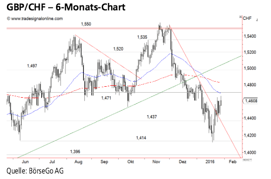 In ihrem Verlauf wurde Anfang August erstmals wieder das Niveau um 1,550 CHF erreicht, ehe eine Abwärtsbewegung an die Unterstützung bei 1,471 CHF zurückführte. Dort startete Mitte Oktober eine weitere Kaufwelle, die das Paar bis knapp über den markanten Widerstand bei 1,550 CHF antrieb. Allerdings konnte das damit verbundene Kaufsignal nicht bestätigt und eine kurzfristige Topbildung nicht verhindert werden. In der Folge kam GBP/CHF stark unter Druck und fiel in einem steilen Verkaufsimpuls unter die Haltemarken bei 1,520 und 1,497 CHF zurück. Als im Dezember auch die mittelfristige Aufwärtstrendlinie unterschritten wurde, gaben die Notierungen nochmals deutlich nach. In der Spitze brach GBP/ CHF bis an die Unterstützung bei 1,414 CHF ein, ehe den Bullen dort eine spürbare Erholung gelang. Diese liess den Wert zuletzt über die steile kurzfristige Abwärtstrendlinie auf Höhe von 1,450 CHF ausbrechen.