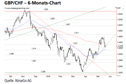 Das Währungspaar GBP/CHF korrigiert aktuell den steilen Anstieg seit Anfang April. Nach dem Ende dieser Korrektur könnte sich die Aufwärtstrendphase jedoch fortsetzen. Die Long-Szenarien: Zunächst könnte das Währungspaar kurz- fristig weiter bis an die Haltemarke bei 1,414 CHF zurücksetzen. An dieser Stelle wäre die Gelegenheit für die Bullen jedoch günstig, den Wert wieder an die 1,431 CHF-Marke zu kaufen. Wird der kleine Widerstand überschritten, sollte es zu einem zügigen Anstieg bis 1,460 und 1,471 CHF kommen. Auf diesem Niveau stünde eine Richtungsentscheidung an: Denn ein Ausbruch über diese Barriere würde ein weiteres Kaufsignal aktivieren, in dessen Folge das Paar bis 1,497 CHF haussieren könnte. Die Short-Szenarien: Setzt der Wert dagegen unter die 1,414 CHF-Marke zurück, wäre zunächst mit einer Ausweitung der Korrektur bis an die 1,396 CHF-Marke zu rechnen. Dort sollten die Bullen wieder in den Wert zurückkommen und einen weiteren mehrtägigen Anstieg auslösen. Sollte sich der Ausverkauf jedoch weiter fortsetzen, drohen bereits Verluste bis 1,381 und 1,372 CHF. Unterhalb dieser Unterstützung wäre die Erholung der letzten Wochen beendet und eine Verkaufswelle an das Verlaufstief des April beziehungsweise bis an die Unterstützung bei 1,338 CHF wahrscheinlich.