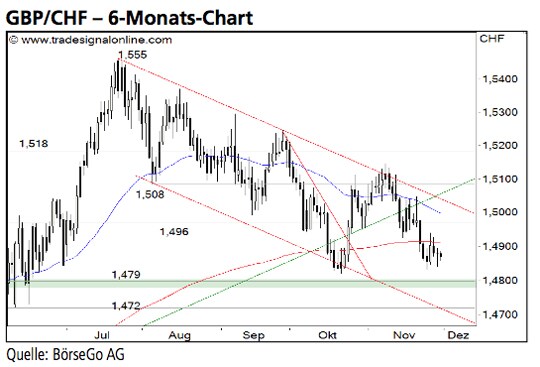 Übergeordnet ist der Abwärtstrend von GBP/CHF weiter intakt. Die Chance auf eine mittelfristige Bodenbildung sollte von den Bullen daher nicht vergeben werden, ansonsten droht ein starker Ausverkauf. Die Long-Szenarien: Zunächst dürfte das Paar bis 1,479 CHF zurücksetzen. Kann diese wich- tige Unterstützung verteidigt werden, dürfte es zur angespro- chenen Bodenbildung kommen. Dabei wäre ein Anstieg über den Widerstand bei 1,496 CHF ein erstes Zeichen für eine ge- lungene Stabilisierung. Im Anschluss könnte der Wert ober- halb dieser Marke bis 1,508 CHF ansteigen. Sollte auch diese Barriere überwunden werden, wäre auch die bullishe Flagge nach oben durchbrochen und ein Kaufsignal aktiv. In der Folge dürfte GBP/CHF in einer dynamischen Kaufwelle bis 1,518 CHF und darüber bereits bis 1,555 CHF haussieren. Entsprechend könnte man einen Anstieg über 1,508 CHF „long“ handeln. Die Short-Szenarien: Sollte die 1,479 CHF-Marke dem aktuellen Verkaufsdruck dagegen nicht standhalten, könnte nur- mehr die kleinere Unterstützung bei 1,472 CHF einen starken Kurseinbruch aufhalten. Unterhalb von 1,472 CHF dürfte es entsprechend zu Verlusten bis 1,459 CHF kommen, ehe eine leichte Erholung zu erwarten wäre. Sollte es jedoch auch zu einem Unterschreiten der 1,459 CHF-Marke kommen, wäre der Aufwärtstrend seit Februar 2012 unterbrochen und eine weitere Verkaufswelle wahrscheinlich. Diese dürfte das Währungspaar bis auf 1,440 CHF zurückführen.