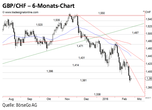 Allerdings bildete sich dort ein bearishes Doppelhoch aus und sorgte in der Folge für Gewinnmitnahmen, die sich mit dem Bruch der mittelfristigen Aufwärtstrendlinie im Dezember 2015 zu einem neuen Abwärtstrend auswuchsen. Dieses Verkaufssignal sorgte für einen Kurseinbruch, der das Paar zunächst bis zur Haltemarke bei 1,414 CHF drückte. Nach einer leichten Erholung kamen die Bären im Februar wieder in den Wert zurück und liessen GBP/CHF unter die 1,414 CHF-Marke einbrechen. In dieser Woche setzte sich der Ausverkauf drastisch fort und sorgte für den kurzzeitigen Bruch der wichtigen Unterstützung bei 1,381 CHF.