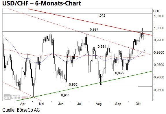 Auch das Währungspaar USD/CHF legte zuletzt deutlich zu. Ausgangspunkt war der erfolgreiche Test der Unterstützung bei 0,965 CHF. Im Anschluss liess USD/CHF den Widerstand bei 0,984 CHF wie auch den dort verlaufenden Abwärtstrend hinter sich und aktivierte auf diese Weise eine Bodenformation im Chart. Seit einigen Tagen konsolidiert das Währungspaar unterhalb einer weiteren Abwärtstrendlinie.