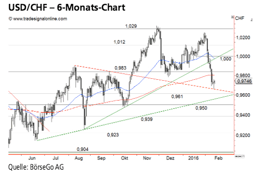Mit dem Anstieg über den Widerstand bei 0,983 CHF setzte sich im Oktober 2015 der Aufwärtstrend beim Devisenpaar USD/CHF zunächst weiter fort. Das Kaufsignal sorgte für eine massive Beschleunigung der Rally, die USD/CHF bis Ende November 2015 an den langfristigen Widerstand bei 1,029 CHF führte.