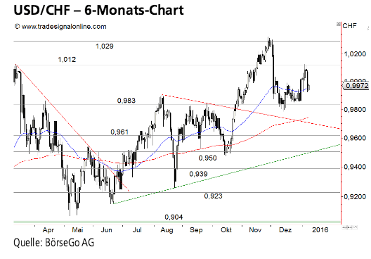 Damit fiel der Startschuss für einen weiteren Aufwärtsimpuls, der den Wert in der Spitze bis an die langfristige Widerstandsmarke bei 1,029 CHF antrieb. Diese Hürde wurde jedoch zur vorläufigen Endstation des Aufwärtstrends: Ende November setzte eine steile Verkaufswelle ein, die das Paar bis an die Unterstützung bei 0,983 CHF einbrechen liess und damit den vorherigen Anstieg neutralisierte. Allerdings wurde diese Marke von den Bullen verteidigt und nach einem zweiten Rücksetzer an dieses Niveau bereits ein dynamischer Anstieg ausgelöst. Die letzten Tage waren von einer steilen Kaufwelle geprägt, die USD/CHF wieder an die Barriere bei 1,012 CHF führte.