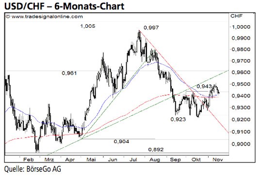 Mittelfristig bleibt der Abwärtstrend des Währungspaares intakt. Kurzfristig könnte es jedoch zu einer leichten Erholung kommen. Die Short-Szenarien: Verbleibt der Wert über 0,938 CHF, kann es zu einem Anstieg bis 0,951 CHF kommen. Oberhalb der Marke dürfte sich die Erholung bis 0,961 CHF ausdehnen. Dort dürften jedoch wieder die Bären in das Geschehen eingreifen und eine weitere Abwärtsbewegung auslösen. Ein Bruch der 0,938 CHF-Marke hätte im Anschluss Abgaben bis 0,923 CHF und darunter bis auf 0,904 CHF zur Folge. Die Long-Szenarien: Erst ein Ausbruch über die mar- kante Hürde bei 0,961 CHF wäre aktuell bullish zu werten. Sollte dies der Käuferseite gelingen, könnte das Devisenpaar zügig bis 0,979 CHF ansteigen. Darüber hätte der Wert weite- res Potential bis 0,997 CHF. Ob diese Marke jedoch gebrochen werden kann, muss aktuell bezweifelt werden.