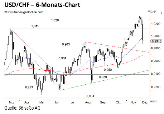 Bereits Mitte März erreichte das Paar beinahe wieder das Ausgangsniveau des Crashs bei 1,029 CHF. Die folgenden Monate waren von einer Korrektur an die Unterstützung bei 0,904 CHF geprägt, von der aus sich der Wert ab Mai wieder in Richtung der 1,029 CHF-Marke aufmachte. Im Oktober sorgte der Ausbruch aus einer Dreiecksformation für eine dynamische Aufwärtsbewegung, die direkt an den Widerstand führte. Trotz mehrfacher Ausbruchsbemühungen misslang es den Bullen jedoch, die 1,029 CHF- Marke zu überwinden. Nach einer kurzen Seitwärtsphase an der Barriere traten die Bären zuletzt wieder auf den Plan und sorgten insbesondere im gestrigen Handel für einen massiven Einbruch, der auch vor der Unterstützung bei 1,012 CHF nicht Halt machte.