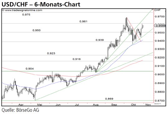 Mit diesem übergeordneten Kaufsignal setzte ein steiler Aufwärtsimpuls ein, der USD/CHF über die Barrieren bei 0,939 und 0,950 CHF antrieb. Schliesslich konnte der Wert kurzzeitig auch über die Kurshürde bei 0,961 CHF ausbrechen, ehe Anfang Oktober erste Gewinnmitnahmen einsetzten, die den Anstieg vorübergehend abbremsten. Bis Mitte Oktober fiel das Währungspaar an die frühere Barriere bei 0,939 CHF zurück. Diese Unterstützung wurde von der Käuferseite verteidigt und in der vergangenen Woche mit dem Anstieg über eine kurzfristige Abwärtstrendlinie ein erstes Kaufsignal generiert. Nach einem weiteren Rücklauf an die mittelfristige Aufwärtstrendlinie auf Höhe von 0,945 CHF setzte sich diese Aufwärtsbewegung in der laufenden Woche fort und führte den Wert im gestrigen Handel zum zweiten Mal an die Barriere bei 0,961 CHF. Von dort setzte USD/CHF zunächst leicht zurück.