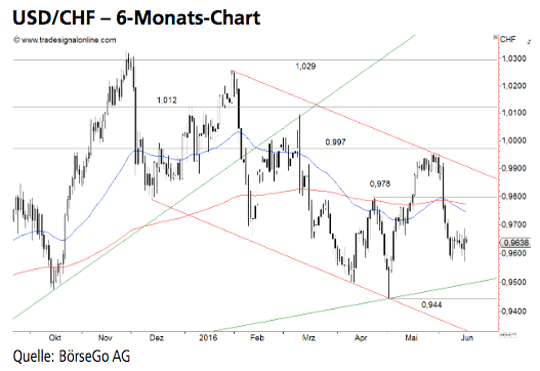 Es wird langsam eine Richtungsentscheidung bei USD/CHF nötig. Die Notierungen werden zunehmend eingeklemmt zwischen dem Aufwärtstrend der vergangenen Jahre und dem Abwärtstrend der vergangenen Monate. Jetzt muss beobachtet werden, welcher Trend sich durchsetzen kann. Die Long-Szenarien: Nachdem sich USD/CHF an den Vortagen stabilisieren konnte, ist ein Anstieg an die 0,978 CHF-Marke bereits kurzfristig wieder möglich. Wird dieser Widerstand durchbrochen, kann ein Angriff auf den bei 0,990 CHF liegenden Abwärtstrend anstehen. Vor allem bei einem Ausbruch über die 0,997 CHF-Marke könnte das Währungspaar grösseres Aufwärtspotenzial entwickeln, sodass auch ein Anstieg bis zu den langfristigen Hochs bei 1,029 CHF in den Fokus rücken würde. Die Short-Szenarien: Sofern sich die Seitwärtsbewegung der Vortage nur als bearishe Konsolidierung darstellt, droht bei einem Rückfall unter die 0,957 CHF-Marke erneut ein beschleunigter Kursrückgang. Dieser könnte die Notierungen unter den längerfristigen Aufwärtstrend führen. Vor allem bei einem Bruch der Unterstützungszone bei 0,944 CHF besteht die Gefahr, mittelfristig wieder in die Region der bei 0,904 CHF liegenden Unterstützung zu fallen.
