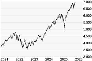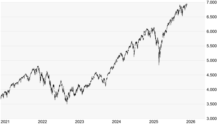 Quelle: Bloomberg. Bitte beachten Sie, dass aus der Wertentwicklung in der Vergangenheit nicht auf die zukünftige Wertentwicklung geschlossen werden kann. | | Charttechnik: Der S&P 500 steuert übergeordnet weiterhin auf die runde Marke von 7.000 Punkten zu. Am Mittwoch ging es in der Spitze bis auf weniger als 35 Punkte bis an die runde Marke heran. Ein Überqueren könnte neue Kräfte freisetzen. Platz nach oben hätte der S&P 500 dann erst einmal reichlich. Allerdings konnte sich der S&P 500 an den vergangenen beiden Handelstagen nur mit Mühe oberhalb des Oktober-Hochs bei 6.920 Punkten behaupten. Sollte es darunter gehen, könnten das Zwischentief vom 2.