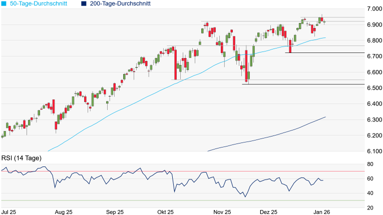 Januar bei 6.824 Punkten und die aktuell bei 6.817 Punkten verlaufende 50-Tage-Linie kurzfristig angesteuert werden. Akute Gefahr auf der Unterseite besteht aber selbst bei einen Unterschreiten noch nicht. Mit dem Zwischenhoch vom 9. Oktober bei 6.765 Punkten und dem Verlaufstief 17. Dezember bei 6.720 Punkten würden noch zwei weitere wichtige Unterstützungen warten.