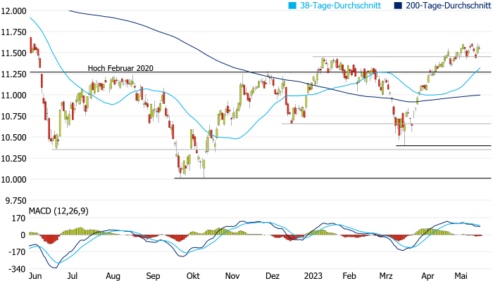 Quelle: Bloomberg. Bitte beachten Sie, dass aus der Wertentwicklung in der Vergangenheit nicht auf die zukünftige Wertentwicklung geschlossen werden kann. | | Charttechnik: Das Chartbild hat sich gestern kaum verändert und ist weiterhin vielversprechend. Auf der Oberseite ist zunächst Platz bis zum Hoch aus der Vorwoche bei 11.616 Punkten, ehe die Hochunkte vom Mai 2022 bei 11.751 und 11.808 Punkten in den Fokus rücken würden. Können auch diese Hindernisse beseitigt werden, würde sich erhebliches Aufwärtspotenzial eröffnen. Auf der Unterseite ist das Januar-Hoch bei 11.454 Punkten aber weiterhin in Reichweite. Ein erneutes Unterschreiten würde wieder