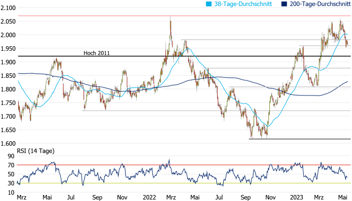 Quelle: Bloomberg. Bitte beachten Sie, dass aus der Wertentwicklung in der Vergangenheit nicht auf die zukünftige Wertentwicklung geschlossen werden kann. | | Charttechnik: Dem Goldpreis scheint auch bei seinem dritten Versuch (nach 2020 und 2022) das nachhaltige Überqueren der 2.000-Dollar-Marke verwehrt zu bleiben. Erneut ging es für einige Tage über die psychologisch so wichtige Marke und bis auf wenige Dollar an das Rekordhoch bei 2.075 Dollar heran, doch konnte sich der Goldpreis erneut nicht oberhalb der Barriere behaupten. Möglicherweise muss das Edelmetall einen weiteren Anlauf nehmen, um die hartnäckige Marke zu überqueren. In der vergangenen Woche