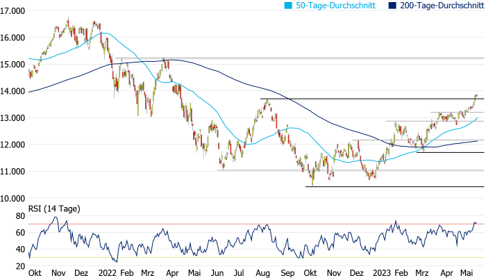 Demokraten und Republikaner über das Anheben der US-Schuldengrenze einigen, ist nicht gesagt, dass das nächste Kursfeuerwerk unmittelbar bevorsteht, denn es liegt bereits eine überkaufte Marktphase vor. Getreu dem Motto "Sell on good news" könnten auch Gewinnmitnahmen einsetzen, weshalb es bei einem Unterschreiten des August-Hochs durchaus noch einmal in Richtung 50-Tage-Durchschnitt gehen könnte, der aktuell bei 13.014 Punkten verläuft.