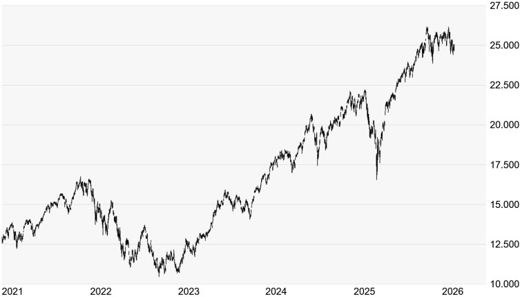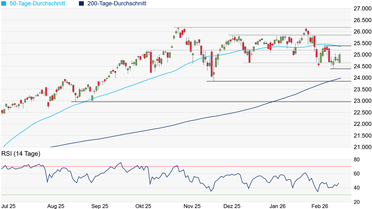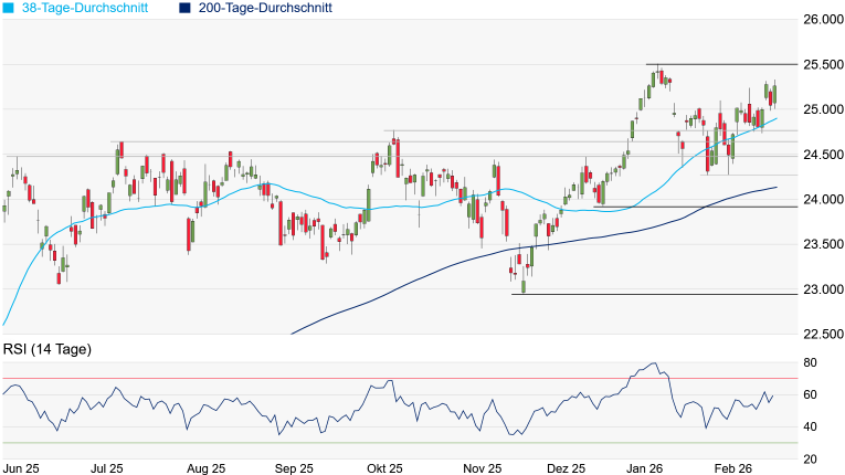 5-Monats-Tief markiert. Doch der NASDAQ-100 schaffte fürs Erste die Wende und hat sich inzwischen sogar wieder über die Marke von 25.000 Punkten gekämpft. Auf der Oberseite würde sich jedoch erst etwas kräftiges Kurspotenzial eröffnen, wenn das Zwischenhoch vom 10. Oktober bei 25.195 Punkten, die aktuell bei 25.359 Punkten verlaufende 50-Tage-Linie und das Zwischenhoch vom 11. Februar bei 25.383 Punkten gemeistert werden. Danach wäre zunächst Platz bis zur Widerstandszone zwischen 25.827