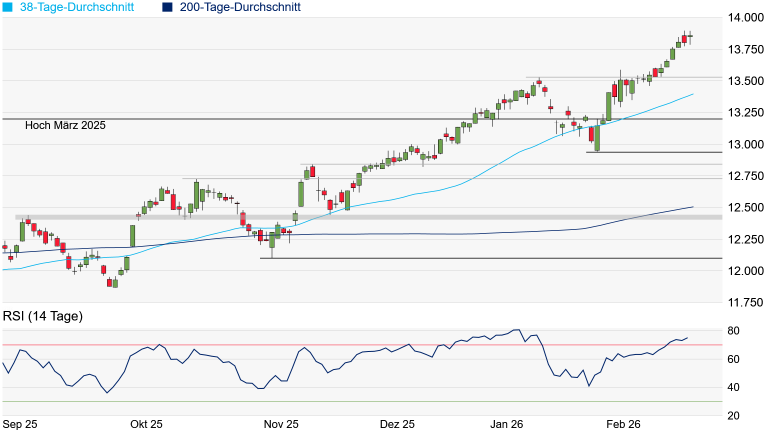 Chartbild auch aussieht, der Start in die neue Handelswoche dürfte etwas holprig verlaufen - die SMI-Indikationen notieren in der Früh moderat im Minus. Kommt es zum Wochenauftakt zu Gewinnmitnahmen, könnte das Januar-Hoch bei 13.529 Punkten durchaus noch einmal in den Fokus rücken. Zuvor würde sich mit dem Zwischenhoch vom 4. Februar bei 13.588 Punkten lediglich noch eine markante Unterstützung in den Weg stellen.