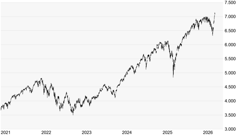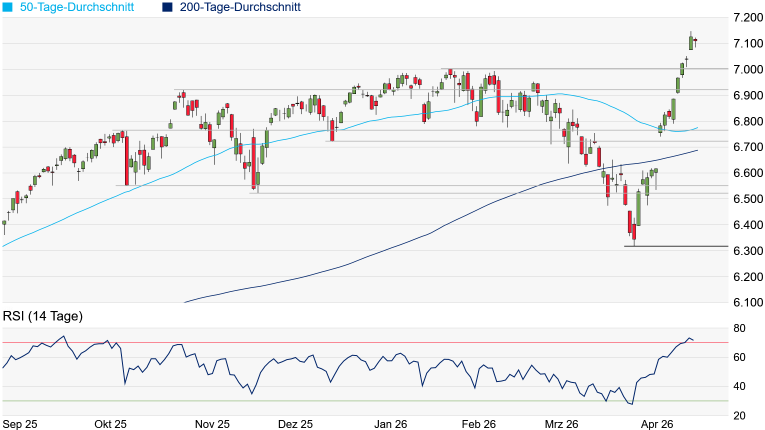 Quelle: Bloomberg. Bitte beachten Sie, dass aus der Wertentwicklung in der Vergangenheit nicht auf die zukünftige Wertentwicklung geschlossen werden kann. | | Charttechnik: Die US-Börsen haben zuletzt eine beeindruckende Rally gezeigt, die den S&P 500 sogar auf neue Rekordhöhen beförderte - am Freitag ging es bei 7.147,52 Punkten auf eine neue historische Bestmarke nach oben. Ohne Fortschritte in den Friedensbemühungen dürfte sich die Rally aber wohl kaum dynamisch fortsetzen, denn es liegt bereits eine deutlich überkaufte Marktphase vor. Kommt es nun erst einmal zu Gewinnmitnahmen, könnte das jüngste Ausbruchsniveau bei 7.002 Punkten, das aus dem Hoch