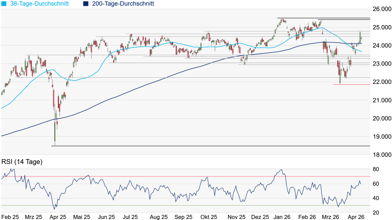 erst einmal wieder neutralisiert. Auf der Unterseite befindet sich die nächste massive Unterstützung nun am aktuell bei 24.114 Punkten verlaufenden 200-Tage-Durchschnitt, ehe der aktuell bei 23.670 Punkten verlaufende 38-Tage-Durchschnitt für Halt sorgen müsste. Die Vorgaben für den Start in den heutigen Handel sind in der Früh allerdings erst einmal leicht freundlich.