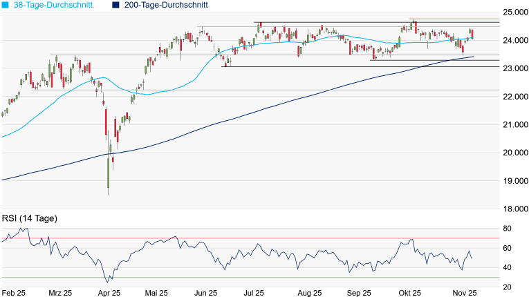 gestern wieder unter seinen aktuell bei 24.108 Punkten verlaufenden 38-Tage-Durchschnitt gefallen, womit sich das kurzfristige Chartbild leicht eingetrübt hat. Setzt sich die gestrige Bewegung fort, könnte das Doppeltop vom März bei 23.476 Punkten durchaus wieder angesteuert werden. Gelingt heute eine Gegenbewegung und wird der 38er-Durchschnitt wieder überquert, wäre zumindest wieder Platz bis zum Juni-Hoch bei 24.479 Punkten.