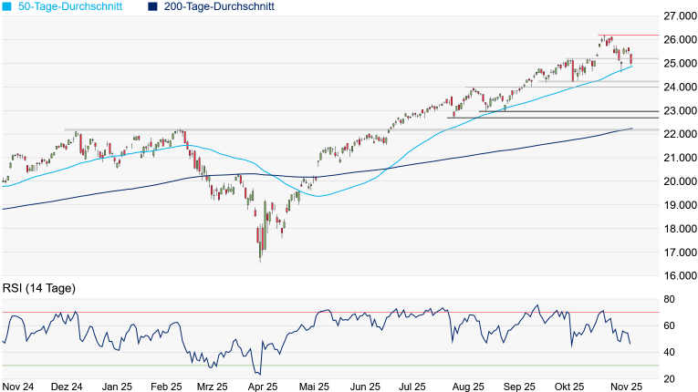 werden. Der NASDAQ-100 könnte somit in der kommenden Woche seinen Abwärtstrend beschleunigen oder zurück in den Rally-Modus kehren. Auf der Oberseite würde aber wohl erst das Überqueren des jüngsten Rally-Hochs bei 26.182 Punkten neue Impulse erzeugen.