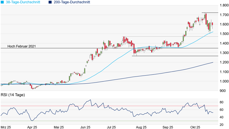 die Dow-Jones-Futures in der Früh um rund 270 Punkte im Plus. In einem freundlichen Marktumfeld könnte das Erreichen der runden 50.000-Punkte-Marke bis zum Jahresende durchaus möglich sein. Allerdings sind dafür starke Quartalsbilanzen der grossen Tech-Konzern notwendig. Kommt es hier hingegen zu Enttäuschungen, könnte der aktuell bei 45.960 Punkten verlaufende 50-Tage-Durchschnitt durchaus wieder ein Thema werden. Etwas gravierender eintrüben würde sich das kurzfristige Chartbild jedoch