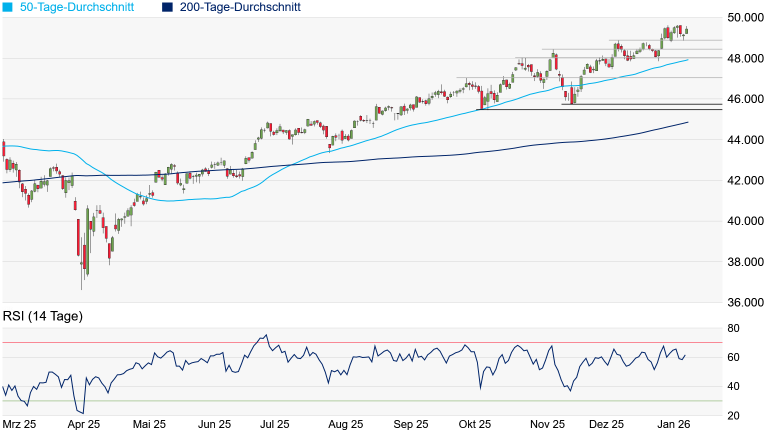 Quelle: Bloomberg. Bitte beachten Sie, dass aus der Wertentwicklung in der Vergangenheit nicht auf die zukünftige Wertentwicklung geschlossen werden kann. | | Charttechnik: Der Dow Jones bewegt sich weiter im Dunstkreis seines erst vor wenigen Tagen bei 49.633 Punkten erreichten Rekordhochs. Die runde 50.000-Punkte-Marke dürfte weiterhin eine hohe Anziehungskraft haben. Eine Überqueren könnte weiteres Kaufinteresse auslösen, weshalb sich Gewinnmitnahmen aktuell im engen Rahmen halten. Die US-Berichtssaison konnte dem Markt bisher noch nicht ihren Stempel aufdrücken, jedoch reagierte er gestern erstmals etwas positiver auf besser als erwartet ausgefallene