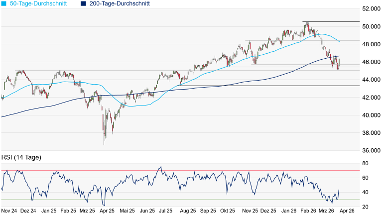 43.341 Punkten eröffnet hätte. Dieses Szenario konnte der Dow zumindest vorerst abwenden. Mit dem gestrigen Kurssprung hat der Dow zudem wieder wichtige Hürden gemeistert. Mit dem Überqueren des November-Tiefs bei 45.729 Punkten hat sich zunächst weiteres Erholungspotenzial bis zur aktuell bei 46.708 Punkten verlaufenden 200-Tage-Linie eröffnet. Wird auch der vielbeachtete Durchschnitt zurückerobert, würde sich die Chart-Situation erheblich entspannen. Gleichzeitig würde der aktuell bei