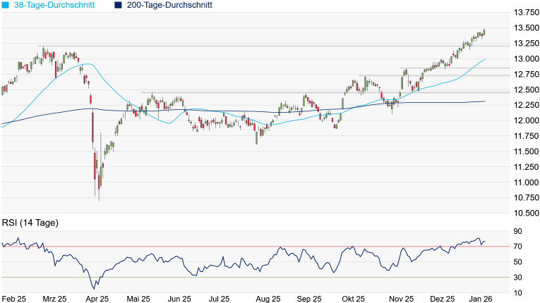 bremsen dürfte. Kommt es zu Gewinnmitnahmen, taucht die erste signifikante Unterstützung erst am März-Hoch bei 13.199 Punkten auf. Weitere solide Unterstützungen warten am aktuell bei 12.990 Punkten verlaufenden 38-Tage-Durchschnitt und am November-Hoch bei 12.843 Punkten.