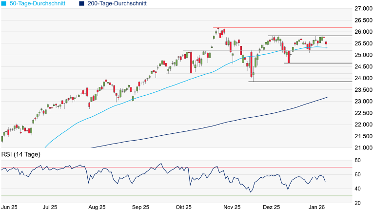 Berichtssaison im Tech-Sektor dürfte grossen Anteil an der künftigen Richtung haben. Auf der Oberseite dürfte zunächst das Zwischenhoch vom Dezember bei 25.835 Punkten im Fokus stehen. Am Montag und Dienstag ging es zwar jeweils leicht darüber, doch konnte die Hürde auf Schlusskursbasis nie gemeistert werden. Gelingt die nachhaltige Überquerung, wäre der Weg in Richtung Rekordhoch vom Oktober bei 26.182 Punkten zumindest unverbaut. Auf der Unterseite stand gestern mal wieder der aktuell