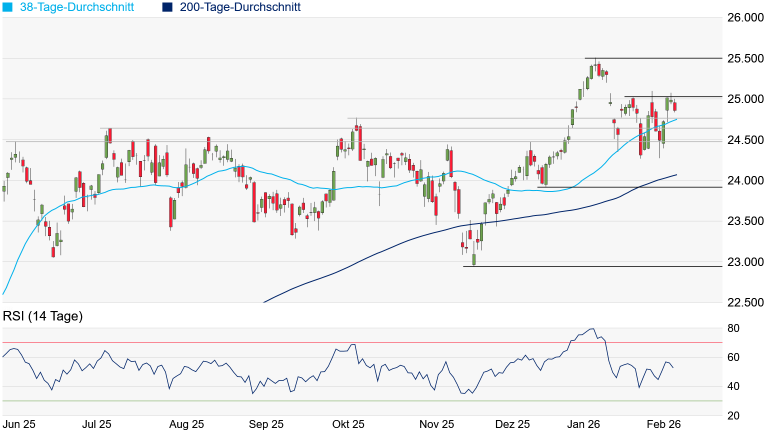runde Marke von 25.000 Punkten nachhaltig hinter sich zu lassen. Gestern ging es sogar wieder etwas deutlicher darunter. Kann der DAX die runde Marke überqueren, würden sich bis zum Rekordhoch vom 13. Januar bei 25.508 Punkten aber noch die Hochpunkte vom 27. Januar bei 25.020 Punkten, vom 10. Februar bei 25.076 Punkten und vom 3. Februar bei 25.099 Punkten in den Weg stellen. Gefahr auf der Unterseite droht zunächst aber kaum. Zwischen 24.771 und 24.479 Punkten würden sich zahlreiche