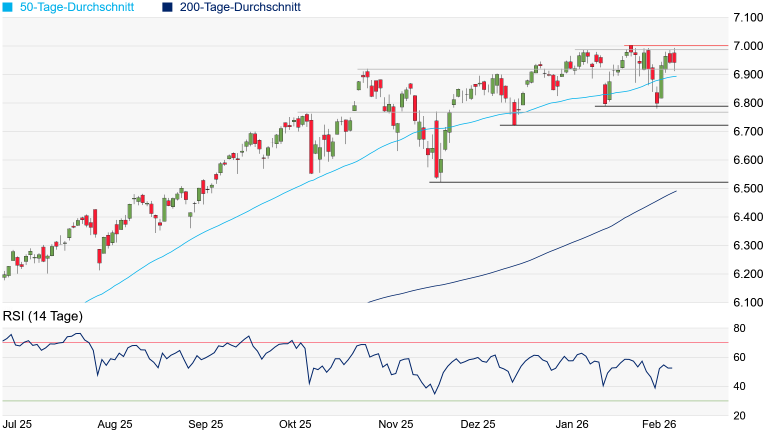 Platz wäre auf der Oberseite danach erst einmal reichlich vorhanden. Allerdings ist es derzeit ein schmaler Grad. Gestern sackte der S&P 500 kurzzeitig sogar unter das Oktober-Hoch bei 6.920 Punkten, womit sich das kurzfristige Chartbild sogar etwas gravierender einzutrüben drohte. Danach hätte nur noch die aktuell bei 6.894 Punkten verlaufende 50-Tage-Linie einen Rücksetzer auf die Tiefpunkte vom Januar bei 6.789 Punkten und Februar bei 6.780 Punkten verhindern können.