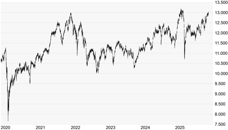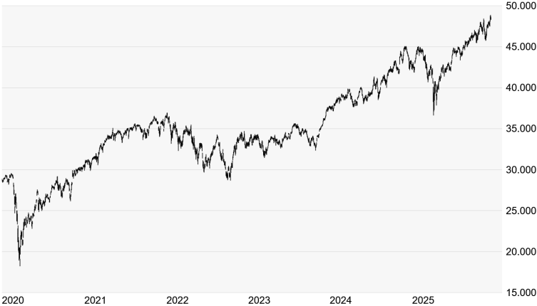 Quelle: Bloomberg. Bitte beachten Sie, dass aus der Wertentwicklung in der Vergangenheit nicht auf die zukünftige Wertentwicklung geschlossen werden kann. | | Charttechnik: Der Dow Jones hat zum Wochenauftakt einen Gang zurückgeschaltet. Erst am Freitag erreichte er bei 48.887 Punkten ein neues Rekordhoch. Aktuell notiert der US-Leitindex zwar knapp 500 Punkte unter seiner neuen Bestmarke, doch erscheint ein Angriff auf die runde 50.000er-Marke bis zum Jahresende noch immer möglich. Und zumindest für US-Standardwerte sehen zahlreiche Experten auch im nächsten Jahr noch Luft nach oben. Die kurzfristige Entwicklung dürfte jedoch stark von den heute Nachmittag