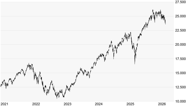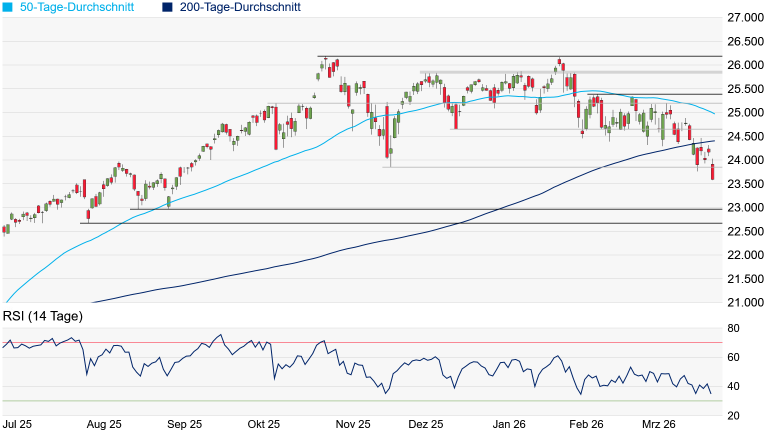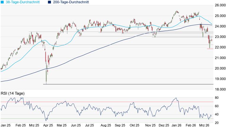 Charttechnik: Der DAX hat gestern nicht nur seine Vortagesgewinne komplett abgegeben, er ist auch erneut unter das November-Tief bei 22.943 Punkten gefallen, womit sich das kurzfristige Chartbild wieder eingetrübt hat. Der Fokus dürfte damit erneut auf das Zwischentief vom 21. Februar 2025 bei 22.226 Punkten gerückt sein. Geht es erneut darunter, würde sich das Chartbild wieder gravierend eintrüben. Wird auch das Tief vom zurückliegenden Montag bei 21.864 Punkten unterschritten, wäre erneut Gefahr in Verzug, denn die nächste signifikante Unterstützung würde dann erst am Korrekturtief vom April 2025 bei 18.490 Punkten auftauchen. Mit der Rückeroberung des November-Tiefs würde sich die Chart-Situation zwar erneut entspannen, doch würde sich das übergeordnete Chartbild erst bei einem Überqueren des Doppeltops vom März 2025 bei 23.476 Punkten etwas gravierender aufhellen.