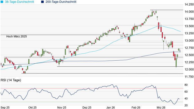 Charttechnik: Für eine Überquerung des Oktober-Hochs bei 12.726 Punkten war das gestrige Marktumfeld nicht geeignet. Im Hoch ging es zwar knapp 4 Punkte darüber, doch blieben die Anschlusskäufe aus und der SMI fiel wieder darunter. Allerdings konnte sich der SMI oberhalb seines erst am Vortag zurückeroberten und aktuell bei 12.612 Punkten verlaufenden 200-Tage-Durchschnitts behaupten, womit sich das kurzfristige Chartbild zumindest nicht wieder eingetrübt hat. Kann der SMI das Oktober-Hoch überqueren, würden sich mit dem November-Hoch bei 12.843 Punkten und dem Januar-Tief bei 12.942 Punkten aber noch weitere Hindernisse in den Weg stellen, ehe sich das Chartbild etwas gravierender aufhellen würde. Wird hingegen die 200-Tage-Linie erneut unterschritten, könnte zunächst ein Rücksetzer auf die Unterstützungszone zwischen 12.441 und 12.403 Punkten drohen, ehe das November-Tief bei 12.101 Punkten und das jüngste Korrekturtief bei 12.054 Punkten noch einmal in den Fokus rücken könnten.