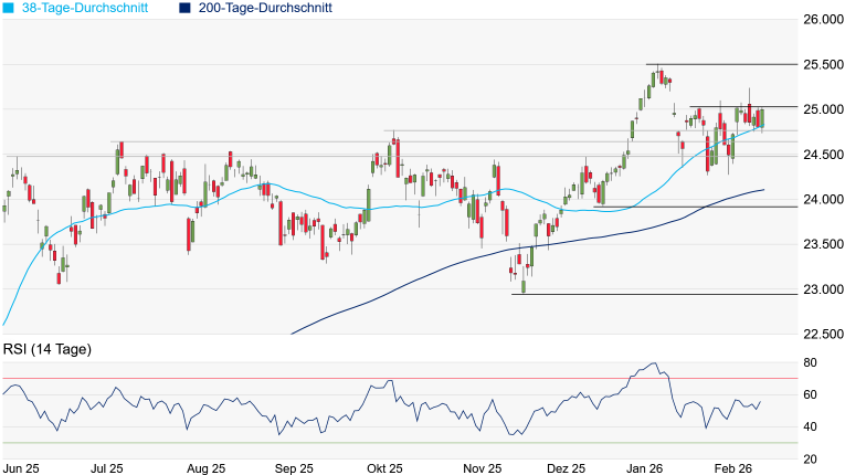 Quelle: Bloomberg. Bitte beachten Sie, dass aus der Wertentwicklung in der Vergangenheit nicht auf die zukünftige Wertentwicklung geschlossen werden kann. | | Charttechnik: Kurz vor Handelsschluss sah es so aus, als könnte der DAX die seit Wochen im Fokus stehende Marke von 25.000 Punkten bezwingen. Wenige Minuten vor der Schlussglocke notierte der DAX noch bei 25.021 Punkten, doch sackte der deutsche Leitindex in der Schlussauktion noch bis auf 24.998 Punkte ab. Aus charttechnischer Sicht hätte das Überqueren des Zwischenhochs vom 27. Januar bi 25.020 Punkten einen positiven Impuls generiert. Danach hätten sich bis zum Rekordhoch vom 13. Januar bei 25.508