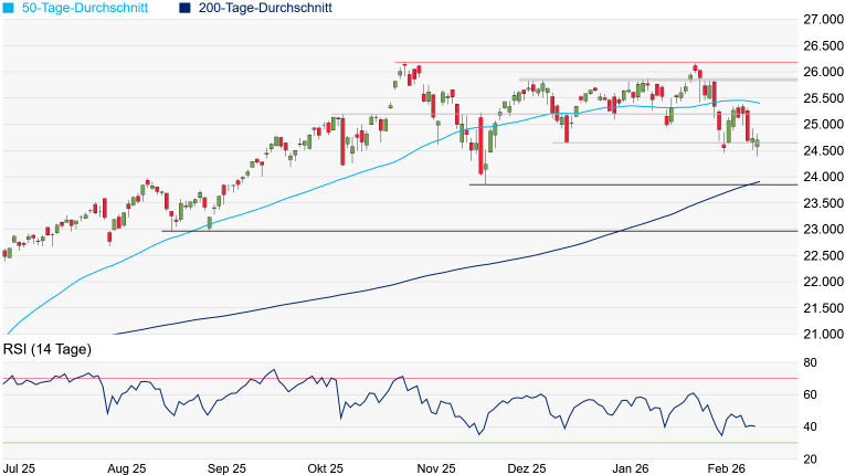 Punkten nur noch die Hochpunkte vom 10. Februar bei 25.076 Punkten, vom 3. Februar bei 25.099 Punkten und vom 12. Februar bei 25.239 Punkten in den Weg gestellt. Doch der Befreiungsschlag ist fürs Erste ausgeblieben. Kurzzeitig drohte sogar akute Gefahr, denn der DAX sackte am frühen Nachmittag auf ein 6-Tages-Tief bei 24.734 Punkten ab, womit der aktuell bei 24.832 Punkten verlaufende 38-Tage-Durchschnitt und das Oktober-Hoch bei 24.771 Punkten deutlich unterschritten wurden. Weitere