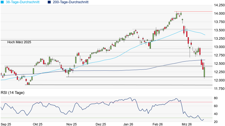 Osten möglicherweise noch nicht entscheidend entspannt hat. Die SMI-Indikationen notieren in der Früh leicht im Minus. Auf der Unterseite trifft der SMI am November-Tief bei 12.101 Punkten weiterhin auf die nächste signifikante Unterstützung, die gestern kurzzeitig bereits unterschritten wurde. Geht es erneut darunter, müsste das September-Tief bei 11.868 Punkten für Halt sorgen. Sollte sich die Lage im Nahen Osten nachhaltig entspannen, könnte sich die Erholung dynamisch fortsetzen. Kann