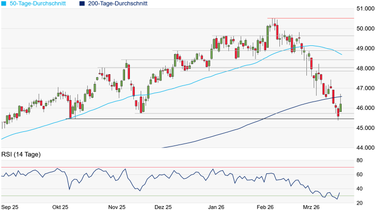 sich die Chart-Situation sogar deutlich zu entspannen, nachdem der Dow über die aktuell bei 46.614 Punkten verlaufende 200-Tage-Linie kletterte. Doch am Ende des Tages schloss der Dow recht deutlich darunter, weshalb sich das Chartbild nicht entscheidend aufgehellt hat. Kann der Dow den 200er-Durchschnitt jedoch nachhaltig überqueren, würde sich zunächst weiteres Erholungspotenzial bis zum Widerstandsbereich bei 47.849/47.853 Punkten eröffnen.